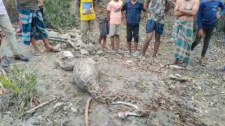 বাগেরহাটের সুন্দরবন এলাকায় দীর্ঘ এক অজগর লোকালয় থেকে একটি ছাগল গিলে ফেলেছে। পরে ছাগলটি গিলে ক্লান্ত হয়ে পড়ে ছিল অজগরটি। মালিক তার ছাগল খুঁজতে বেরিয়ে সাপটিকে দেখতে পান। খবর পেয়ে প্রায় ১৫ ফুট দৈর্ঘ্য ও ৩৫ কেজি ওজনের অজগরটিকে উদ্ধার করে বনে অবমুক্ত করেছে বন বিভাগ। আজ মঙ্গলবার সকালে বাগেরহাটের শরণখোলার রসুলপুর গ্রামের বনসংলগ্ন ভোলা নদীর চরে এ ঘটনা ঘটে।