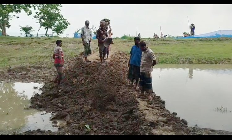 নেত্রকোনার মোহনগঞ্জ উপজেলার করাচাপুর এলাকার কেওরাখালী খাল দিয়ে ডিঙ্গাপোতা হাওরে পানি প্রবেশ শুরু করেছে। এতে হাওরের বোরো ফসল ঝুঁকিতে পড়েছে। ফসল রক্ষায় স্থানীয় কৃষকেরা স্বেচ্ছাশ্রমে খালে বাঁধ নির্মাণ করছেন। আজ বৃহস্পতিবার সকালে সরেজমিন দেখা যায়, স্থানীয় কৃষকেরা মাটি কেটে কেওরাখালী খালে বাঁধ দিচ্ছেন।
