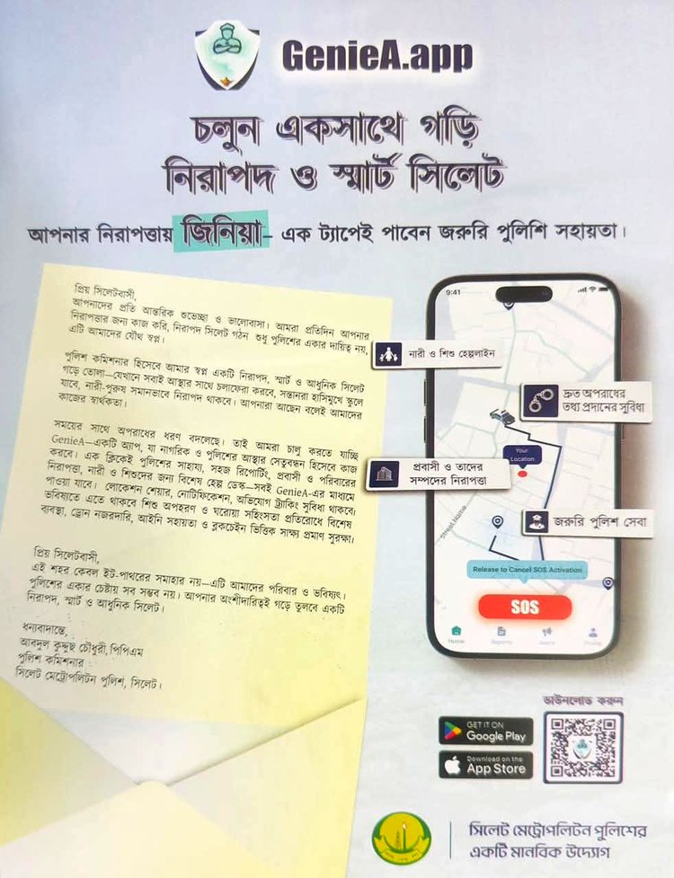 নগরবাসীর নিরাপত্তা ও সেবাকে সহজলভ্য করতে ‘GenieA’ নামে নতুন একটি মোবাইল অ্যাপ চালু করেছে সিলেট মেট্রোপলিটন পুলিশ (এসএমপি)। গতকাল মঙ্গলবার নিজ কার্যালয়ের কনফারেন্স রুমে অ্যাপটির উদ্বোধন করেন এসএমপি কমিশনার আবদুল কুদ্দুস চৌধুরী।