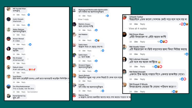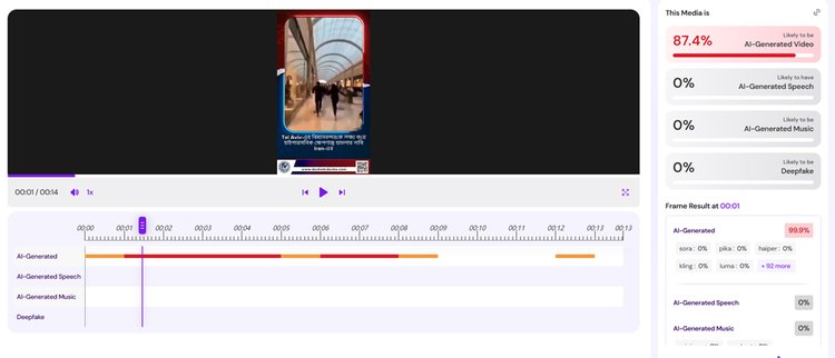তেল আবিবের বেন গুরিয়ন বিমানবন্দরে ইরানের হাইপারসনিক ক্ষেপণাস্ত্র হামলার দাবিতে ছড়িয়ে পড়া ভিডিওটির কোনো নির্ভরযোগ্য উৎস পাওয়া যায়নি। আন্তর্জাতিক গণমাধ্যমেও এই ভিডিওর উল্লেখ নেই। উপরন্তু এআই শনাক্তকারী প্ল্যাটফর্মের বিশ্লেষণে এটি কৃত্রিম বুদ্ধিমত্তা দিয়ে তৈরি হওয়ার সম্ভাবনা অনেক বেশি বলে জানা গেছে।