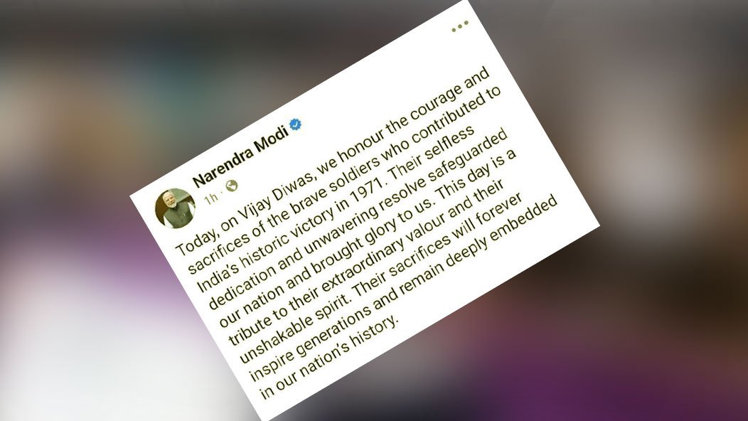 নরেন্দ্র মোদি ইংরেজিতে দেওয়া টুইটের বাংলা করলে দাঁড়ায়, ‘বিজয় দিবসে আমরা সেই সাহসী সৈন্যদের স্মরণ করি, যাঁদের সাহস ও আত্মত্যাগ ১৯৭১ সালে ভারতের এক ঐতিহাসিক বিজয় নিশ্চিত করেছিল।’ তিনি আরও বলেন, ‘তাঁদের দৃঢ় সংকল্প এবং নিঃস্বার্থ সেবা আমাদের জাতিকে রক্ষা করেছিল এবং আমাদের ইতিহাসে গর্বের একটি মুহূর্ত খোদাই করে রেখেছে। এই দিন তাঁদের বীরত্বকে স্যালুট জানায় এবং তাঁদের অতুলনীয় চেতনার কথা মনে করিয়ে দেয়। তাঁদের বীরত্ব ভারতের প্রজন্মকে অনুপ্রাণিত করে চলেছে।’