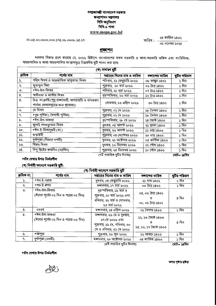 উপদেষ্টা পরিষদে অনুমোদনের পর সব সরকারি ও আধা সরকারি অফিস, সংবিধিবদ্ধ, স্বায়ত্তশাসিত এবং আধা সরকারি সংস্থার ২০২৬ সালের সরকারি ছুটির তালিকা প্রকাশ করেছে সরকার।