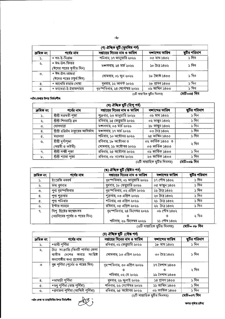 ২০২৬ সালেও রোজার ঈদে পাঁচ দিন, কোরবানির ঈদে ছয় দিন এবং দুর্গাপূজায় দুই দিন করে ছুটি রাখা হয়েছে।
