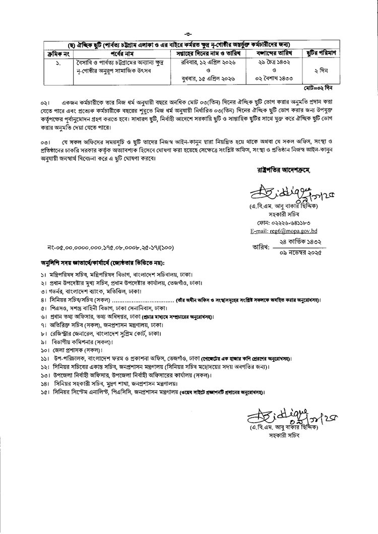 ঐচ্ছিক ছুটি (পার্বত্য চট্টগ্রাম এলাকা ও এর বাইরে কর্মরত ক্ষুদ্র নৃগোষ্ঠীর অন্তর্ভুক্ত কর্মচারীদের জন্য): ১২ ও ১৫ এপ্রিল বৈসাবি ও পার্বত্য চট্টগ্রামের অন্য ক্ষুদ্র নৃগোষ্ঠীগুলোর অনুরূপ সামাজিক উৎসব।