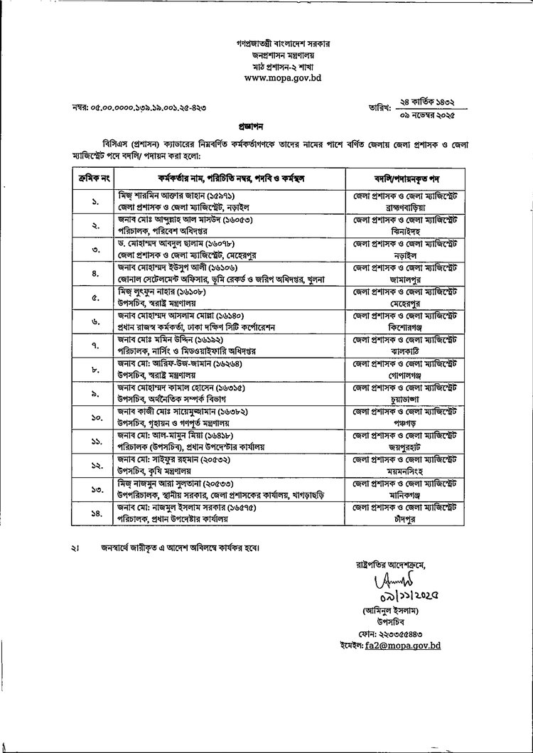 পরিবেশ অধিদপ্তরের পরিচালক মো. আব্দুল্লাহ আল মাসউদকে ঝিনাইদহ, খুলনার ভূমি রেকর্ড ও জরিপ অধিদপ্তরের জোনাল সেটেলমেন্ট অফিসার মো. ইউসুপ আলীকে জামালপুর, স্বরাষ্ট্র মন্ত্রণালয়ের উপসচিব লুৎফুন নাহারকে মেহেরপুর, ঢাকা দক্ষিণ সিটি করপোরেশনের প্রধান রাজস্ব কর্মকর্তা মোহাম্মদ আসলাম মোল্লাকে কিশোরগঞ্জ, নার্সিং ও মিডওয়াইফারি অধিদপ্তরের পরিচালক মো. মমিন উদ্দিনকে ঝালকাঠি, স্বরাষ্ট্র মন্ত্রণালয়ে উপসচিব মো. আরিফ-উজ-জামানকে গোপালগঞ্জের ডিসি করা হয়েছে।